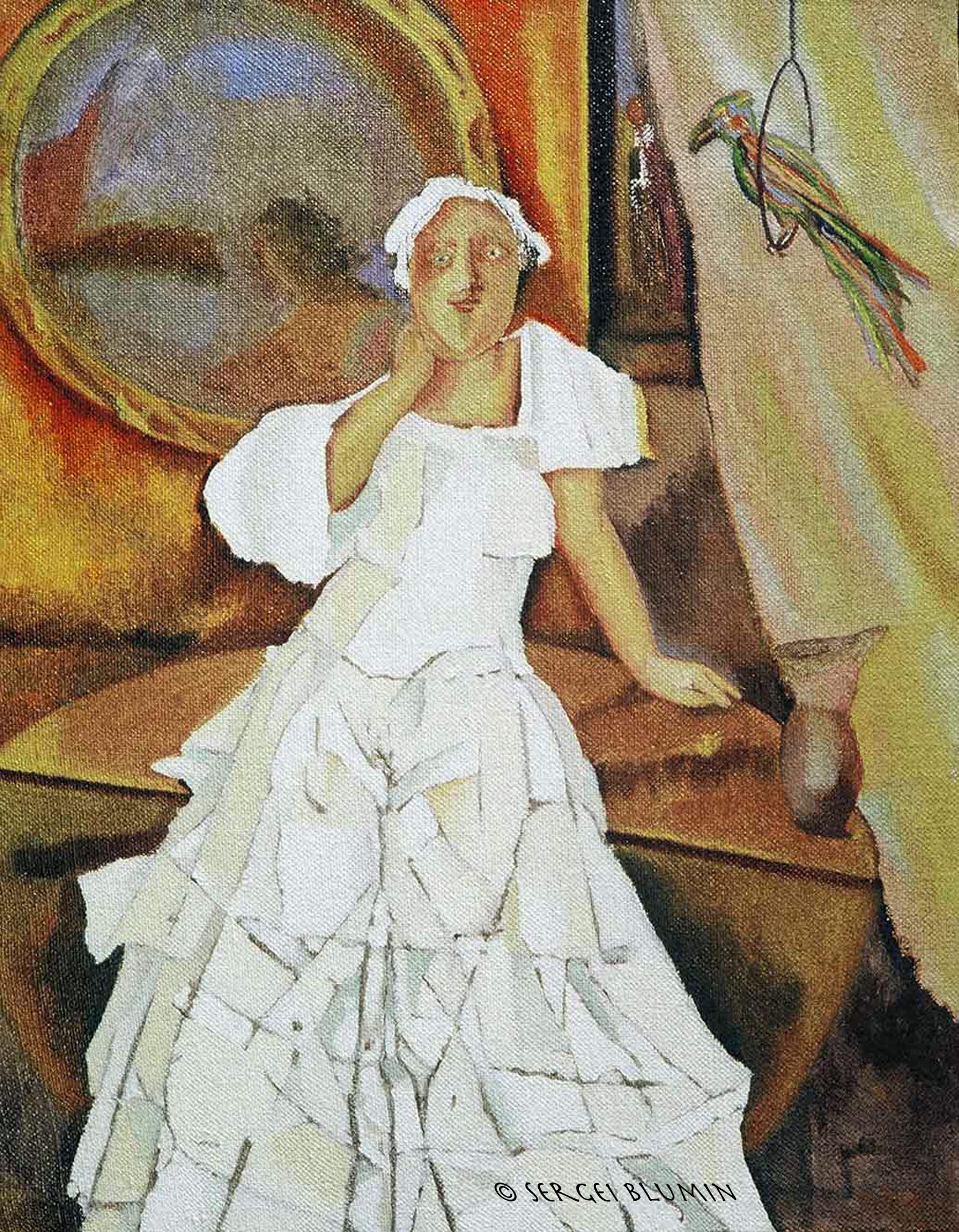 © S. Blumin, Art History Lesson - Lady with Parrot, signed, unframed author's print of oil painting, 1990